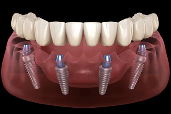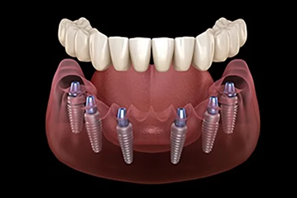 - Mungesa e disa dhëmbëve mund të zëvendësohet me ura që mbështeten mbi implante dentare. Në këtë mënyrë mund të zëvendësohet edhe e gjithë harkada dentare.